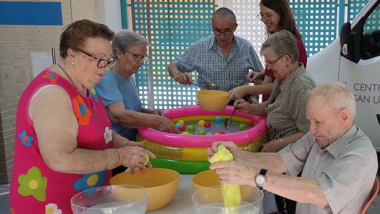 Estos meses de verano los usuarios demandan actividades diferentes a las que se programan el resto del año. "Les gusta salirse de la rutina y trabajamos todas las capacidades mediante yincanas con juegos fresquitos con agua, talleres o excursiones", traslada Andrea Ruiz, terapeuta ocupacional en el CDM San Luciano. Así, en este centro de día celebrarán durante los meses de julio y agosto los días de la sandía y el melón, creando brochetas con estas frutas; el Día de los Abuelos, con un desayuno especial en el jardín; el Día del Peatón, dando un paseo para identificar señales de tráfico, o la verbena de la Paloma, que "les encanta porque es muy castiza y van con sus mantones".