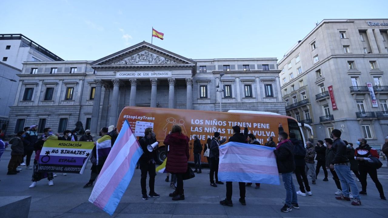 Muchos de los manifestantes iban ataviados con banderas del orgullo trans. Hasta el lugar, también se ha acercado el autobús de HazteOir.org, que ha vuelto a salir a la calle para denunciar la aprobación de la ‘Ley Trans’ , después de que hace cuatro años denunciaron el adoctrinamiento sexual impuesto por las leyes LGTBI y la ideología de género.