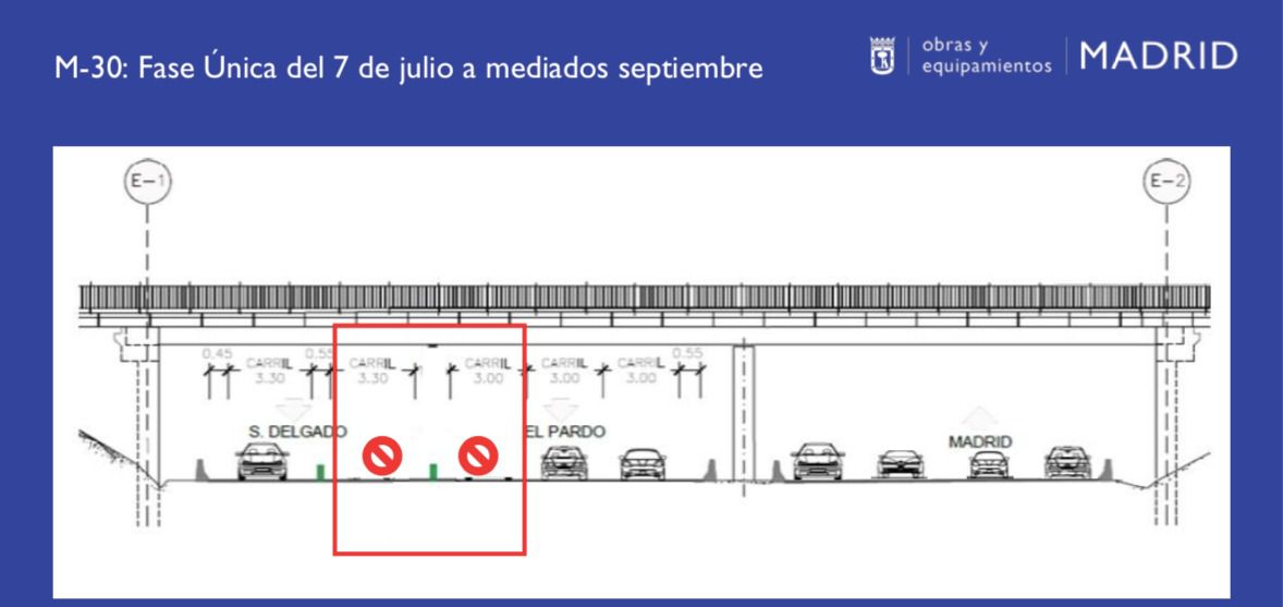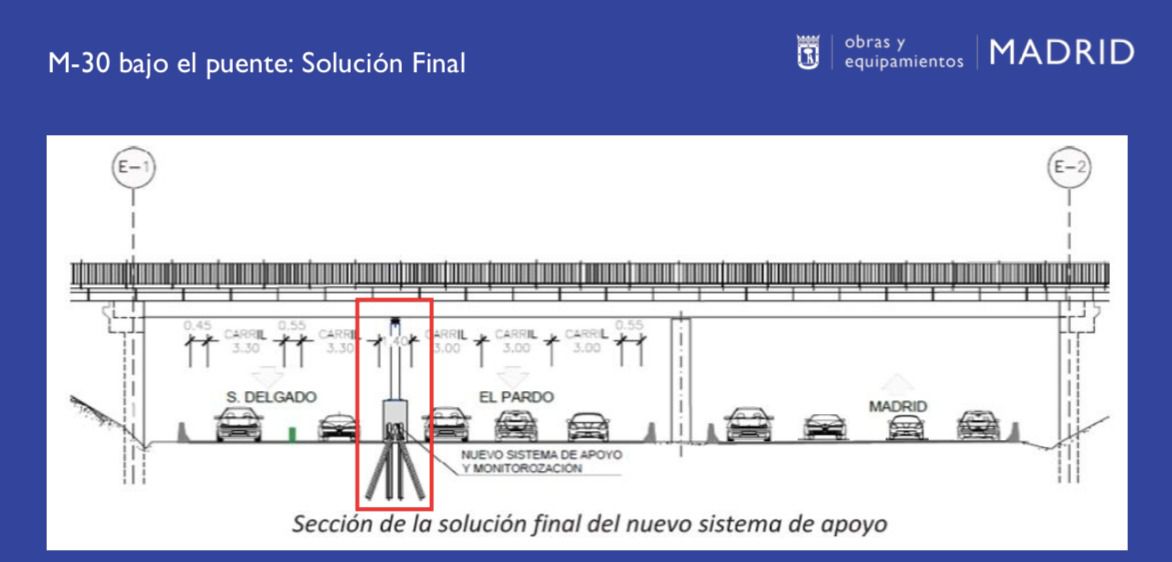 La intervención en la M-30 se desarrollará en paralelo, pero en una única fase. Consistirá en la implantación de una hilera de cinco pilares que sujeten el puente en la parte norte -dirección Avenida de la Ilustración- para mitigar la curvatura. En ellos se incorporarán sensores "que nos informarán de si hemos cortado para siempre la enfermedad o de cómo va evolucionando de año en año para que la seguridad sea permanente", ha apuntado la concejala García Romero. Como la actuación se focaliza en ese lateral concreto, en la vía de circunvalación solo se cortarán al tráfico dos carriles: el derecho sentido norte y el anexo de salida a Dehesa de la Villa desde la madrugada del 7 de julio. La circulación no se interrumpirá ni en los otros dos carriles sentido norte ni en los dos sentido sur -hacia Moncloa-.