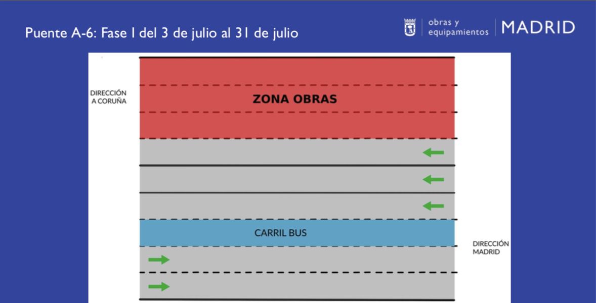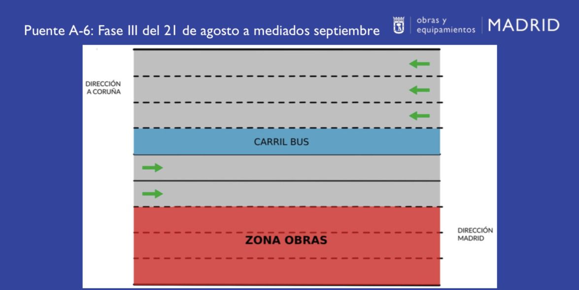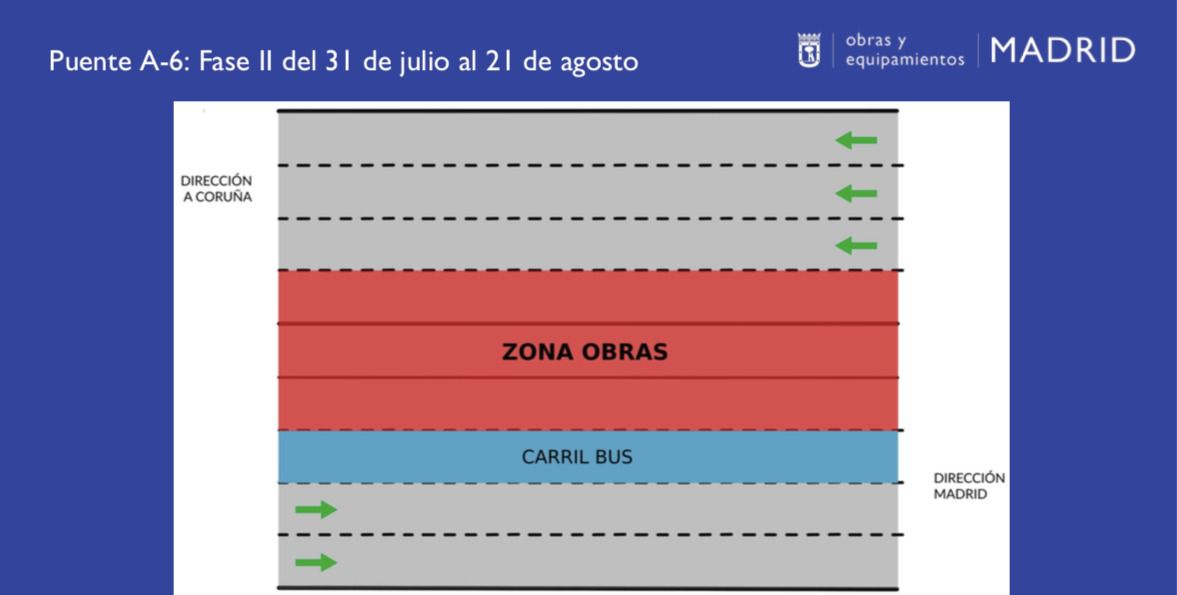 En la A-6, que transcurre sobre el puente, la intervención se dividirá en tres fases. En cada una de ellas los operarios ocuparán tres de los nueve carriles, pero en todo momento quedarán operativos los seis carriles restantes: dos en sentido entrada, tres en sentido salida y el carril Bus-VAO que variará su ubicación. Del 3 al 31 de julio la zona de obras ocupará los tres carriles de la zona norte de la autovía- dirección salida, hacia A Coruña-. Del 31 de julio al 21 de agosto este área de obras se traslada a la parte central y del 21 de agosto hasta mediados de septiembre se trabajará en el margen contrario, en tres carriles dirección sur -entrada a Madrid-. Durante estos dos meses y medio, el área de Obras y Equipamientos impermeabilizará la estructura, repondrá el firme e instalará nuevos sistemas de contención de vehículos.