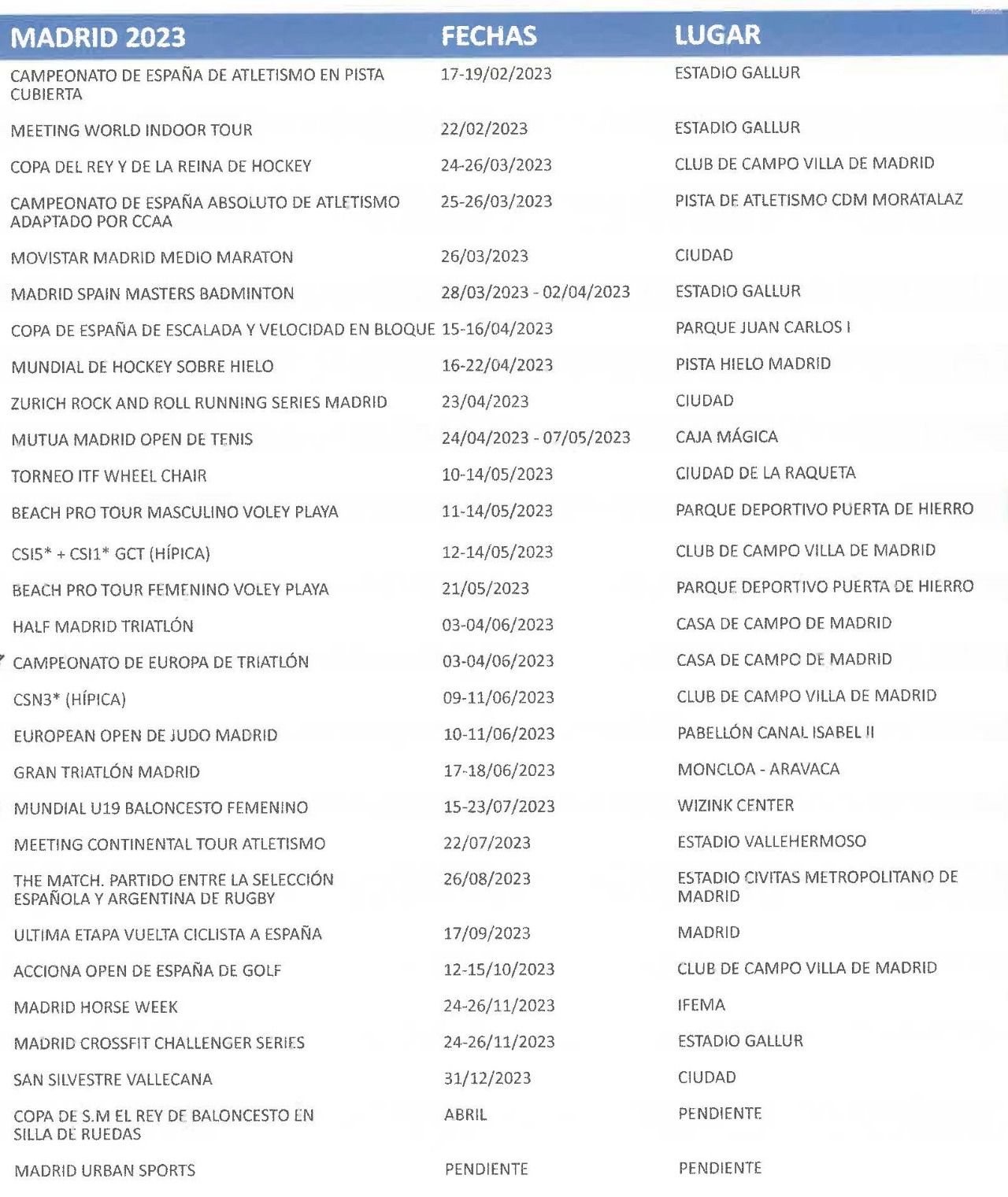 Madrid ostentó en 2022 la capitalidad mundial del deporte y "las federaciones internacionales quieren volver aquí". La ciudad no ha perdido comba en el mapa deportivo internacional tras el título y el Ayuntamiento ha agendado para 2023 el Mundial de Hockey sobre Hielo en abril, el Europeo de Triatlón que puntúa para los Juegos Olímpicos de París en junio y el Mundial sub-19 de Baloncesto Femenino en julio. También marcado con fluorescente en el calendario el 7 de febrero, cuando los Chicago Bears de la Liga Nacional de Fútbol Americano (NFL) participarán en un campus con colegios en el campo de rugby de Las Leonas. En paralelo, el inicio de las obras del parque de deportes urbanos en Villaverde y la adecuación de varios polideportivos y canchas.