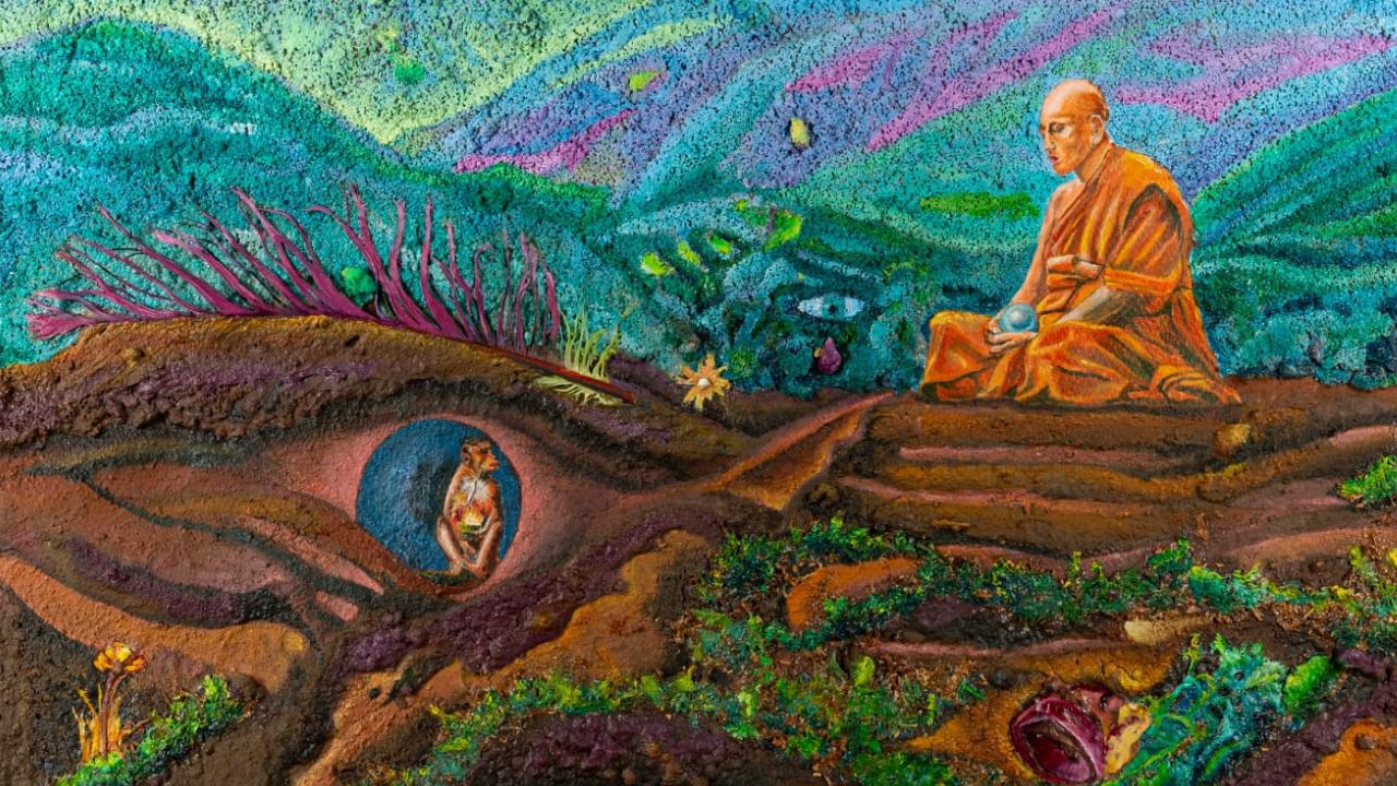 Tras su jubilación y motivado por el efecto de la pandemia, decidió que debía dedicarle más tiempo a las expresiones pictóricas. En la exposición 'A través de la mirada', Joaquín Sanz habla de espiritualidad a lo largo de los años. Y en ese concepto se detiene el artista, en concreto en lo que se refiere a las creencias que se basan en el budismo. "Siempre me ha gustado mucho este tema. El budismo se encuentra dentro de uno mismo. Se trata de un sentir y un modo de vida", relata. La relación que mantiene con la creencia budista la califica de "fluida" y alejada del ego: "Cuando te das cuenta que te has aferrado al ego y lo superas, ves las cosas de otra manera".