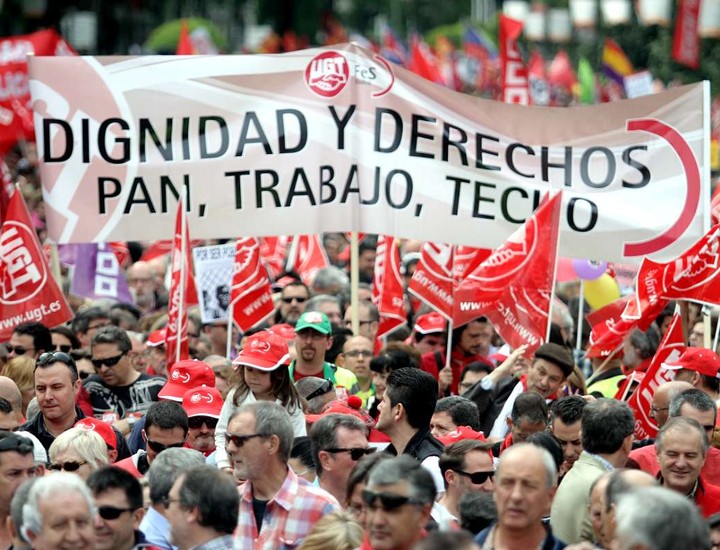 CC.OO. y UGT recorrieron las calles del centro de Madrid para reivindicar empleo de calidad, salarios dignos y el establecimiento de una renta mínima que garantice unos ingresos básicos mientras las personas no puedan encontrar empleo.
