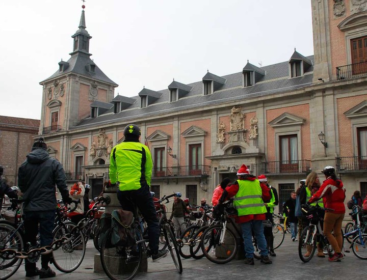 Decenas de personas han participado este martes en la cuarta edición de la San Silvestre ciclista, que ha recorrido varias calles del centro de la capital, desde la Plaza de la Villa hasta la Puerta del Sol. Allí los participantes se sumaron a los cientos de madrileños y turistas que celebraban la 'prenochevieja' con el último ensayo general de las campanadas.