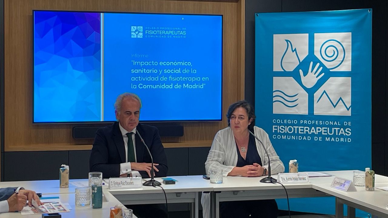 Por primera vez, el Colegio Profesional de Fisioterapeutas de la Comunidad de Madrid (CPFCM) dimensiona económicamente la profesión, a través de un informe realizado con la colaboración de la consultora PwC, que han presentado esta mañana la decana del CPFCM, Aurora Araújo, y el consejero de Sanidad de la Comunidad de Madrid, Enrique Ruiz Escudero.