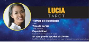 La primera especialista en la cartomancia que te haremos mención es Lucia. A pesar de, que lleve un corto tiempo siendo parte de las mejores videntes y tarotistas, no se puede negar la gran capacidad que tiene para las lecturas de cartas del tarot. Es muy recomendado, fiable y barato que puedes solicitar desde cualquier parte del mundo, inclusive desde Panamá por teléfono.