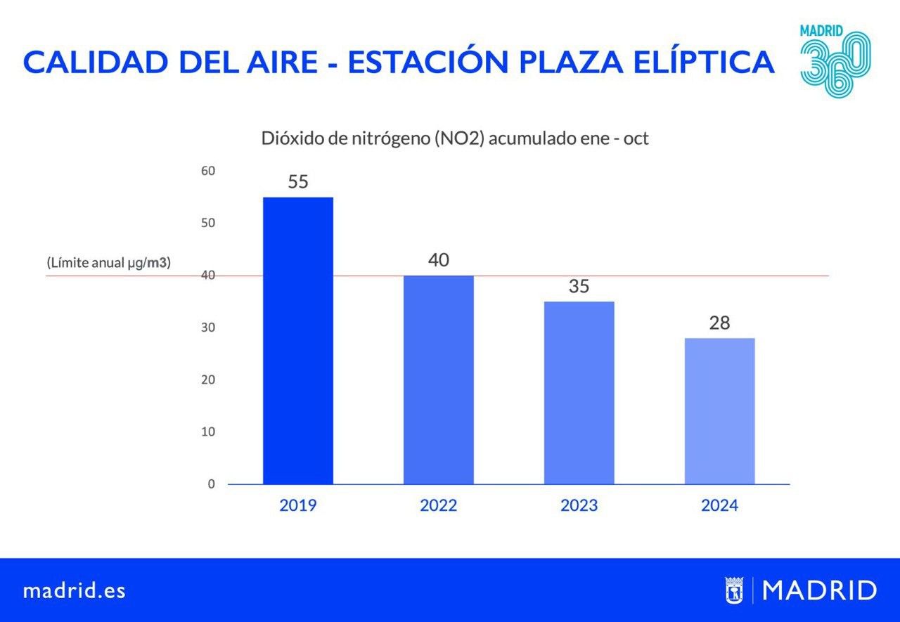 En 2018, que es el último año considerado en la sentencia condenatoria del Tribunal de Justicia europeo contra España por los continuos incumplimientos de Madrid, Barcelona y Bajos del Llobregat desde 2010, se rebasó el límite en siete estaciones; mientras que en 2019, fueron tres las que lo hicieron. Durante los años 2020 y 2021, únicamente una estación, Plaza Elíptica, excedió los 40 μg/m3. Fue en 2022 cuando se logró mantener los niveles de NO2 por debajo de este umbral, cumpliendo así con la normativa europea por primera vez. Este logro se repitió en 2023 y se espera que continúe con cifras aún más bajas en este 2024. Los niveles de NO2 cerraron octubre por debajo de los 28 μg/m3 en Plaza Elíptica. En cuanto a las cifras anuales, en 2023 se registraron 35 μg/m3; en 2022, 40 μg/m3; en 2021, 39 μg/m3; en 2020 también, con un registro de 40 μg/m3; y en 2019, cuando estaba vigente Madrid Central, alcanzaron los 55 μg/m3.