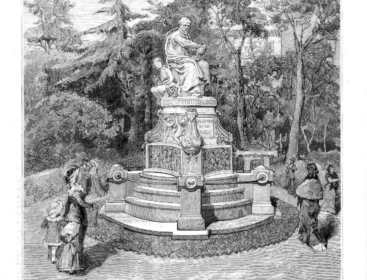Mientras llegaba el entierro, en el centro de la plaza se inauguraba el monumento a Calderón. A la una de la tarde, la ceremonia se interrumpió cuando el cadáver del literato recibió el homenaje de público y actores ante el teatro municipal. Después, se descubrió el conjunto escultórico.