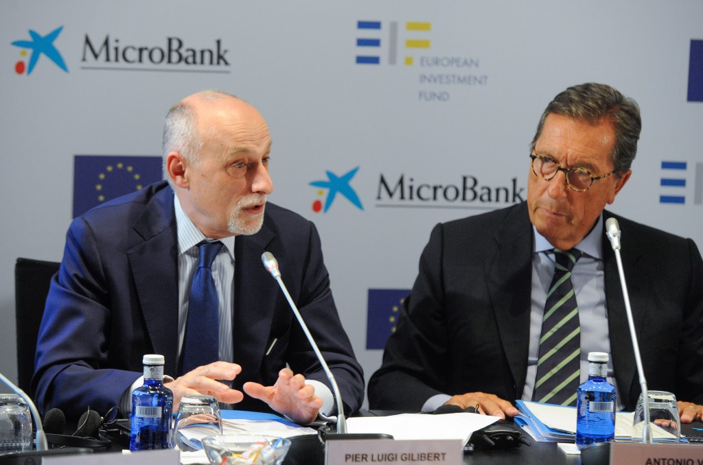 Antonio Vila, presidente de MicroBank, y Pier Luigi Gilibert, director ejecutivo del FEI, durante la presentación del acuerdo entre MicroBank y el FEI (Foto: CaixaBank)