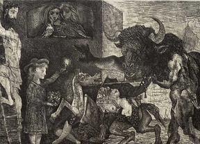 'La Minotauromaquia', que se expone por primera vez en la sede de Madrid de la fundación Juan March, fue elaborada por Picasso en febrero de 1935 en el taller de Roger Lacourière en París. La imagen presenta varias acciones simultáneas en un mismo espacio. Como figuras principales, una niña que porta una vela encendida y un ramo de flores y, en abierto contraste con ella, la enorme figura del Minotauro. Completan el cuadro una mujer vestida de torero con los senos descubiertos sobre una yegua herida; detrás de la joven, un hombre barbudo que huye por una escalera, y, finalmente, dos mujeres que contemplan la escena desde una ventana en la que se han posado dos palomas.
