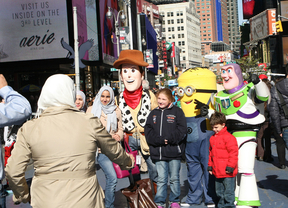 No es la Puerta del Sol... pero podría serlo. Y es que los turistas que intentan fotografiarse en Times Square sufren la misma persecución que en Madrid por las decenas de personas disfrazadas