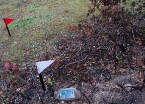 Una vez delimitada la zona de inicio del incendio, el agente señala con banderolas rojas la dirección del viento y con banderolas blancas los elementos extraños,
