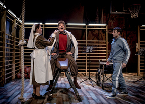 Pero es que, como acaba reconociendo Arenas, todo fue una gran locura: el desarrollo posterior a la Guerra Civil, el seguidismo a la Alemania Nazi, la División Azul... Una locura que sumergió a España en cuatro décadas de oscurantismo. Dionisio Ridruejo renegó de todo aquello y esa "caída del caballo" es el eje de la segunda parte. Juan Carlos Pérez de la Fuente realiza una dirección férrea de todos y cada uno de los elementos teatrales. Vuelve a lo que se ha dado en llamar teatro ceremonial, ritual, haciendo una puesta en escena barroca, delirante, sobrecogedora en algunos momentos. Y cuenta para ello con cinco excelentes actores. Al frente de ellos un monumental Ernesto Arias, capaz de transmutarse hasta la locura fanática y de someterse a un texto diabólico y extenuante. A su alrededor se encuentran Paco Lahoz, generalísimo en la sombra, socarrón, cruel, implacable. Daniel Muriel es el joven capitán -¿UMD?- deseoso de emprender una revolución, atrapado entre el deber de obediencia y su espíritu renovador. Ante el aquelarre franquista que arman sus superiores, se refugia en el ejercicio físico como catarsis. Al final, es el puente de esperanza. Jesús Hierónides y Nerea Moreno completan el elenco en estado de gracia.