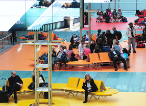 Otro problema fue el de la luminosidad. "Logramos que no hubiera agobios gracias a las grandes alturas y al sistema de iluminación natural y artificial", dice Lamela. "La cubierta está colocada a una altura que oscila entre los 5 y los 13 metros, según el punto de la ola, y, en cuanto a la luz, creo que al final conseguimos que fuera una terminal bien iluminada, aunque cuando estás trabajando como aquí, en mitad del campo, donde la claridad es total te planteas si te has pasado con el cerramiento", añade Hernández.