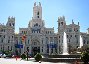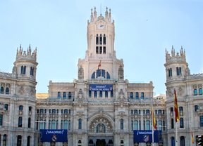 La fachada principal del Ayuntamiento de Madrid luce las banderas de Real Madrid y Atlético de Madrid, los equipos que disputarán la final de la Champions el 24 de mayo en Lisboa. Se trata de la primera vez en la historia de la Copa de Europa en la que los finalistas comparten ciudad, algo que supone un festejo anticipado para la capital, que acogerá el trofeo pase lo que pase.