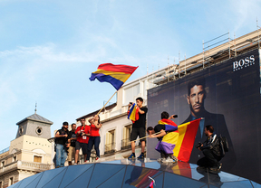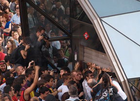 Dos jóvenes han sido aplaudidos cuando se han subido a la nueva cúpula de acceso y salida del Metro de Madrid en la Puerta del Sol portando sendas banderas republicanas. Otras de las consignas más repetidas han sido "No hay dos sin tres, república otra vez", "Que viva la lucha de la clase trabajadora" o "Los borbones a los tiburones".
