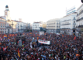 Los manifestantes han ocupado todo el espacio central de la Puerta del Sol. Los agentes de la Unidad de Intervención Policial (UIP) se han desplazado a las calles aledañas. Entre las numerosas banderas 'tricolor' se han podido ver al menos dos del PSOE, y otras tantas de las Juventudes Comunistas y de Equo.
