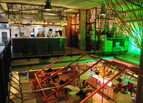 En sus casi 700 metros cuadrados de superficie total, que se distribuyen en tres plantas, alberga 18 puestos de estética cien por cien callejera, tres barras de servicio (una por planta), mesas altas corridas franqueadas por algún que otro taburete y dos terrazas. La principal está recubierta por un graderío de madera que genera la sensación de estar en una plaza más de las que esconde el barrio de Malasaña y la segunda está rodeada de vegetación a modo de parque urbano.