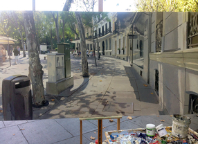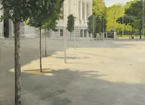 Hoy, tras haber pasado por la cátedra Francisco de Goya (Ávila) y haber disfrutado hasta el pasado mes de julio una beca en la Casa de Velázquez a la que entregó un cuadro sobre la acera del Congreso, que este viernes la embajada de Francia tiene previsto colgar en su palacete de la calle Saturnino Olózaga, este pintor ha retomado su obra por las calles de Madrid. Porque, desde que en 2010 comenzó a realizar una serie de cuadros en torno al museo del Prado, Madrid la capital se ha convertido en su leitmotive. "Se me ocurrió dar un vuelco a un cuadro de campo sobre la puerta de Murillo y realicé siete vistas del Prado, dos del Reina Sofía y una de la entrada del Thyssen. En ellas, los museos aparecen al fondo,sin apenas protagonismo. Tras ver mi obra, me invitaron a París donde hice una exposición individual con el nombre de Une rencontre au Prado en la galería George D'etais. Para mí, que he realizado exposiciones colectivas en las galerías Jorge Alcolea y Miquel Alzueta, fue la primera de forma individual".