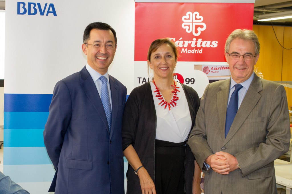 Ramón Rodil, director de zona Madrid Salamanca-Retiro de BBVA, y Noelia Carrillo, directora de cuenta de instituciones de BBVA, han visitado de la mano de Salvador García de Pruneda, responsable del servicio diocesano de empleo de Cáritas Madrid, el Taller 99 junto con Fransi Romero, responsable de dicho espacio.