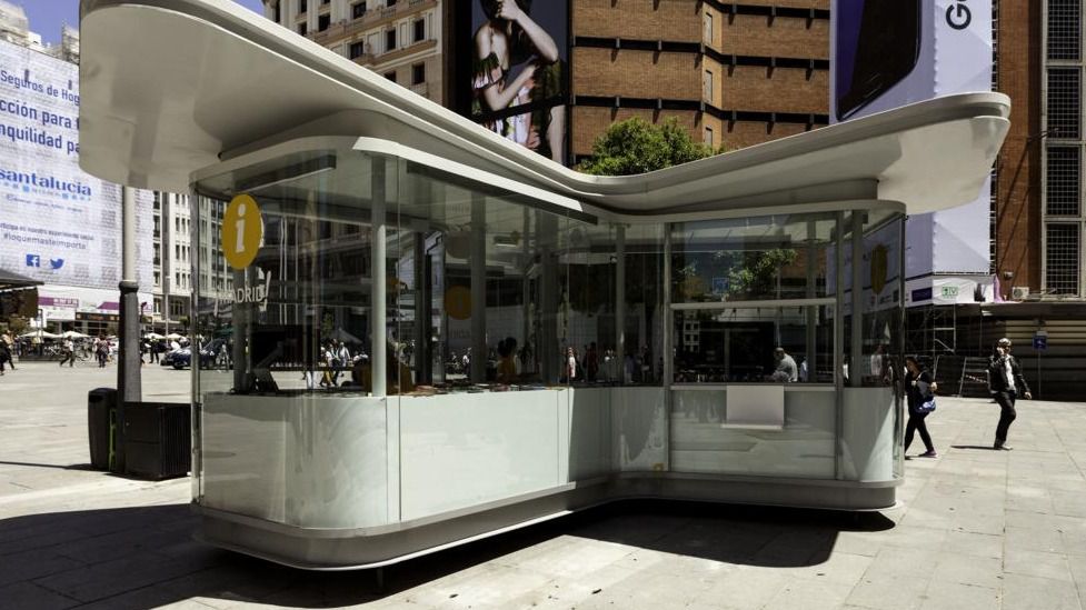 Estos kioskos, construidos en vidrio y acero, pueden verse en puntos como la plaza de Callao, las inmediaciones de la plaza de Colón o en el paseo del Prado. Según figura en sus ventanales, este proyecto de ‘Modernización de puntos de información turística’ se ha realizado con la colaboración del Fondo Europeo de Desarrollo Regional. Los kioscos son de titularidad municipal, dependientes de Madrid Destino.