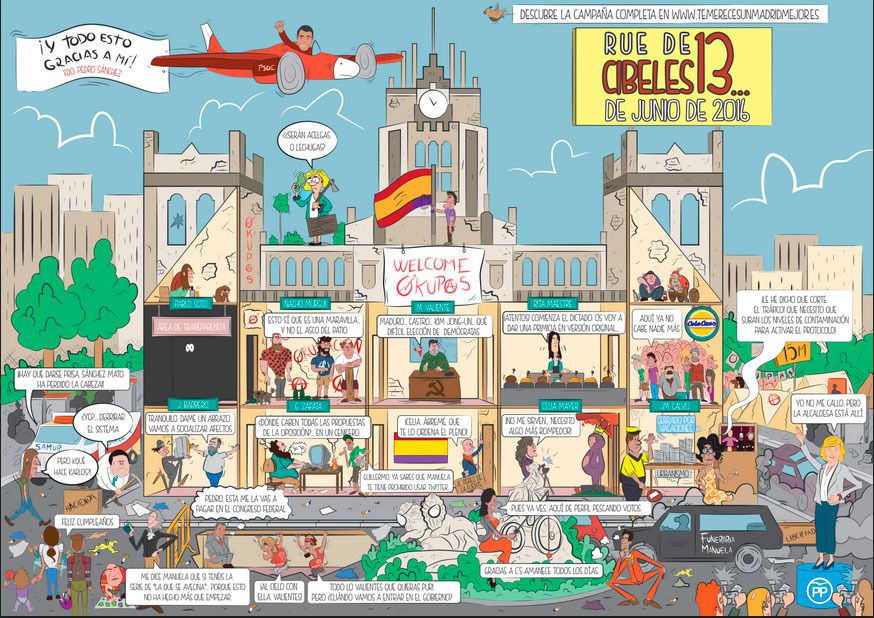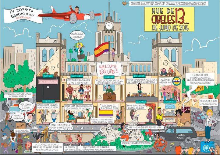El Grupo Municipal del Partido Popular ha presentado este lunes una viñeta en tamaño DIN-A3 en el que se caricaturiza al equipo de Gobierno de Ahora Madrid como si vivieran en el '13 Rue de Cibeles', que se repartirá como propaganda electoral en las mesas informativas del partido, dentro de la campaña 'Te mereces un Madrid mejor'.