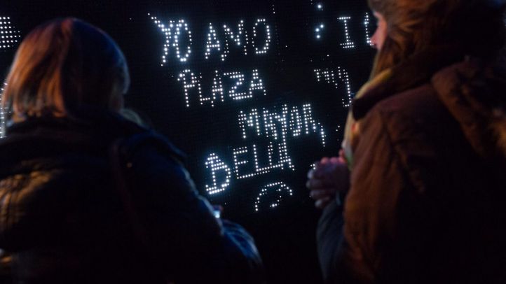 Dos días después del comienzo de la primavera, la Plaza Mayor ha vuelto a acoger actos por su IV centenario. Desde este jueves y hasta este domingo, el público podrá lucirse en un mural gigante situado en el céntrico lugar. En un panel de alta definición de 16 metros de longitud realizado con miles de luces LED, la gente puede dibujar y escribir con agua.
