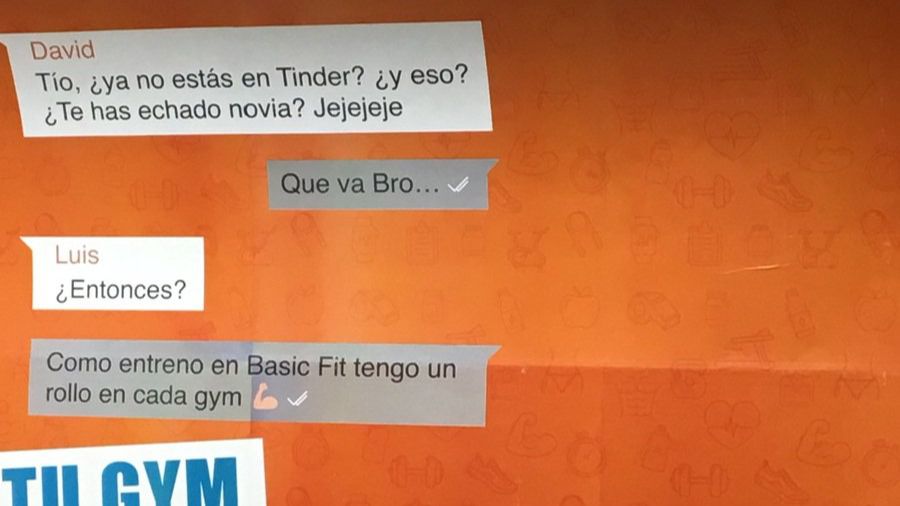 "Tío, ¿ya no estás en Tinder? ¿y eso? Te has echado novia?", pregunta David, a lo que Luis responde: "Que va Bro..., como entreno en Basic Fit tengo un rollo en cada Gym", exponía el lema publicitario.