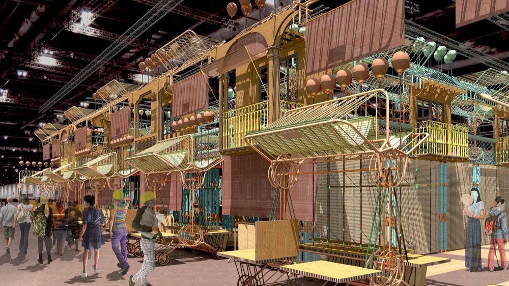 Con el objetivo de concienciar a los ciudadanos sobre la importancia de rebajar el impacto ambiental de la actividad humana, parte de los elementos empleados en el stand diseñado por la arquitecta madrileña Izaskun Chinchilla, son materiales de derribo, reciclados o proceden de la transformación de objetos ya existentes.