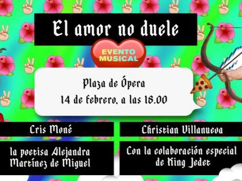 Los cantantes Christian Villanueva y Cris Moné y la poetisa Alejandra Martínez de Miguel actuarán en un formato cercano, cantando o recitando y transmitiendo que el amor no es controlar a la pareja a través del móvil o de las redes, controlar las relaciones sociales o la ropa, sino que es una relación de igual a igual, basada en el respeto de la autonomía y la libertad de las personas. El evento contará con la colaboración especial de King Jedet.