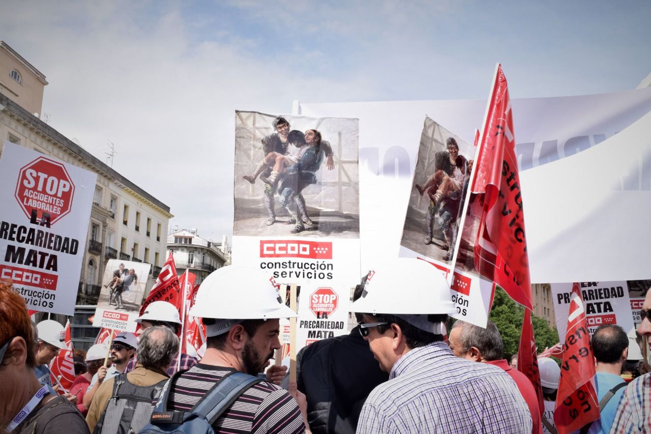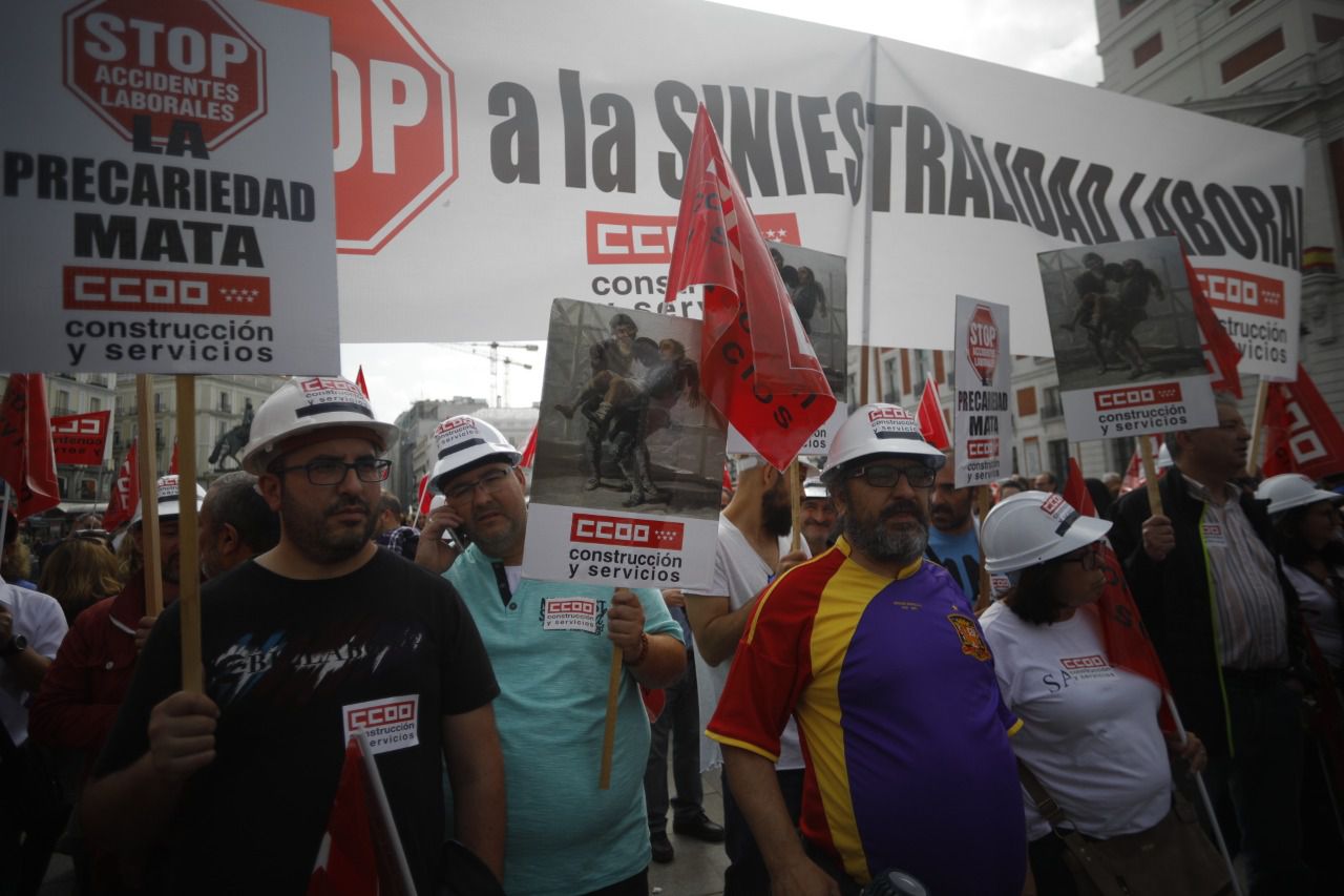 CCOO y UGT se han concentrado este viernes en la Puerta del Sol contra las condiciones de trabajo y la "precariedad laboral", tras el accidente ocurrido el pasado 22 de mayo en el derrumbe del edificio situado en el número 19 de la calle general Martínez Campos de Madrid, donde fallecieron dos personas y las otras 24 muertes a "consecuencia de la siniestralidad laboral".