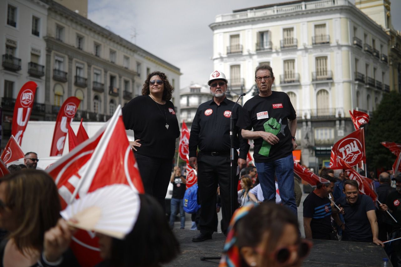 Los sindicatos de CCOO y UGT se han concentrado este viernes en la Puerta del Sol para clamar contra la 'siniestralidad laboral' y la falta de derechos de los trabajadores. Desde los grupos sindicales, otro de los puntos que han exigido ha sido la derogación de la Reforma Laboral, el cumplimiento de la Ley de Prevención de Riesgos Laborales y su normativa de desarrollo para que combata contra el empeoramiento de las "condiciones de salud y seguridad".