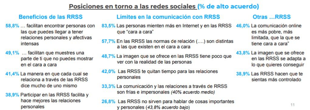 Aún así, los jóvenes no se plantean perder su conectividad ya que encuentran en las redes sociales (RRSS) un aliado para encontrar personas con las que establecer relaciones personales o afectivas intensas. Entre otras ventajas, lo consideran un medio que facilita "mostrar una parte de ellos mismos que no pueden exhibir en el cara a cara". El 85 por ciento de ellos es consciente de que las personas "mienten más en Internet que en persona" y un 48,7 por ciento apunta que "la imagen que se ofrece de las personas en los perfiles poco tiene que ver con su realidad". Inlcluso se inhiben de compartir ciertos contenidos si perciben que sus publicaciones -o su imagen- no serán aceptados por sus followers.