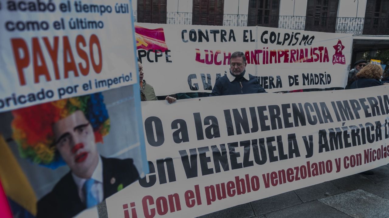 La visita de Juan Guaidó y las diferentes condecoraciones otorgadas al presidente de la Asamblea Nacional de Venezuela han traído también polémica a las calles de Madrid. Bajo la lluvia, alrededor de 200 personas -la mayoría pertenecientes al Partido Comunista de España (PCE)- han protestado frente al Ministerio de Exteriores con pancartas con lemas como 'Contra el Golpismo, lucha antiimperialista, Guaidó fuera de Madrid' o 'No a la injerencia imperialista en Venezuela y América Latina. ¡Con el pueblo venezolano y con Nicolás Maduro!'.