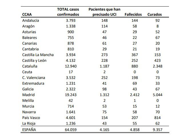 El número de personas fallecidas con coronavirus este viernes asciende a 4.858, 769 más que las notificadas el jueves por el Ministerio de Sanidad. Según el último balance de la institución sanitaria, los casos desde el inicio de la pandemia en España ascienden a 64.059 frente a los 56.188 de los últimos datos.