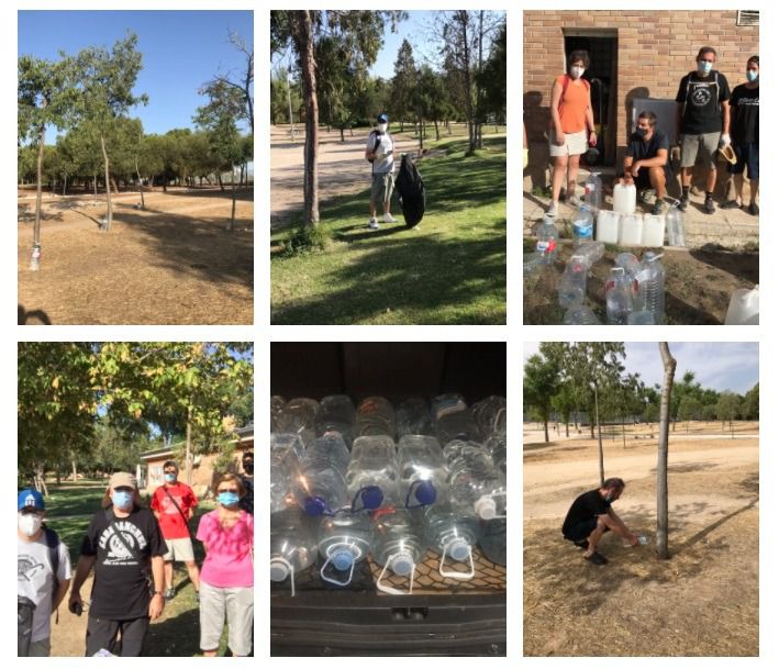 Así que, ante la pasividad de los organismos públicos y viendo que el pulmón del barrio cada vez se encontraba menos verde, desde la Mesa del Árbol decidieron actuar por sí mismos y promovieron, a través de las redes sociales, una acción vecinal de riego. El grupo, formado por vecinos y familiares, se reúne los sábados por la mañana y, con sus propias garrafas de agua llenadas desde casa, se dirigen hacia el parque y riegan el máximo terreno posible, con la dificultad añadida de que las fuentes del recinto no están en funcionamiento para evitar contagios por coronavirus. Dicha acción tienen prevista seguir haciéndola durante lo que queda de mes y septiembre.