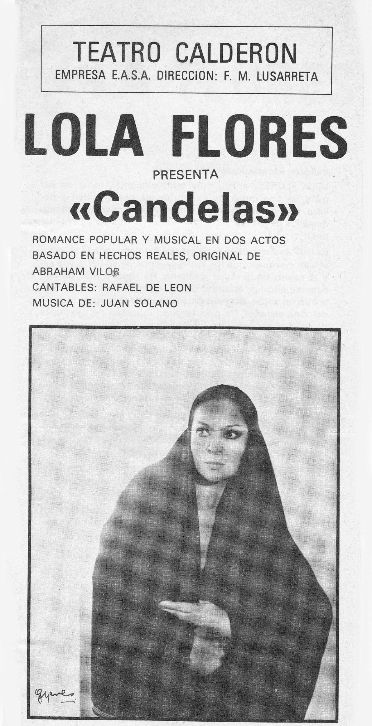 Lola Flores fue una artista inclasificable. Cantaba y bailaba con unos estilos muy peculiares pero también demostró una extraordinaria capacidad dramática en algunas interpretaciones para el cine y la televisión. Sin embargo se la recuerda mucho más por ser un ciclón sobre los escenarios. Nacida en Jerez de la Frontera el 21 de enero de 1923, debutó profesionalmente en esa ciudad el 10 de octubre de 1939 con el espectáculo Luces de España. A principio de la década de los cuarenta, toda la familia se trasladó a Madrid y Lola actuó en el teatro Fontalba como telonera de un espectáculo encabezado por Mari Paz. Allí cantó por primera vez El lerele. Un año más tarde participaba en Cabalgata, un espectáculo del teatro Coliseum. Sus mayores triunfos comenzó a conseguirlos junto a Manolo Caracol en la serie de espectáculos titulada Zambra, el primero de los cuales se estrenó en La Zarzuela en 1944. El último, en 1949, en La Latina. Lola tuvo especial predilección por el teatro Calderón de Madrid, donde estrenó hasta ocho espectáculos, el último, Candelas, en 1977.
