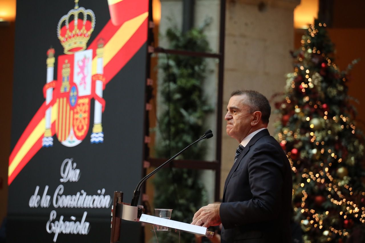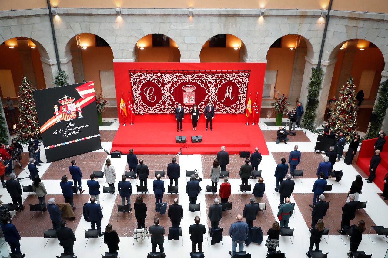 El patio de la Real Casa de Correos, sede del Gobierno regional, ha acogido este viernes el tradicional acto de conmemoración de la Constitución, una celebración institucional marcada por la presencia de todos los representantes regionales y autoridades que este año ha contado con un limitado aforo de invitados y medios de comunicación debido a las restricciones sanitarias.