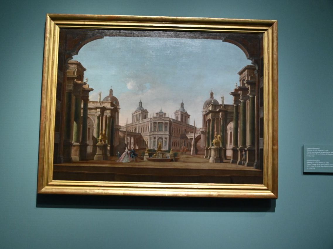 De Goya se exponen Pase de capa, una singular obra que está pintada sobre hojalata, y La cucaña, una deliciosa estampa popular. Es también impactante la visión de la plaza Mayor en el siglo XVIII de Antonio Joli. Este enclave ha sido uno de los favoritos de los artistas en cualquier época y está muy presente en la muestra. Otra sorprendente obra es la panorámica del jardín y palacio del Buen Retiro, que constituye uno de los mejores planos del mismo y fuente de información para los investigadores. De este recinto -y de su teatro- se exponen dos monumentales escenografías de la mitad del siglo XVIII. Panorámicas, como la tomada desde el río Manzanares o desde la calle de Alcalá hacia la puerta del mismo nombre, son testimonios de la grandeza de una ciudad que fue capital del mundo.