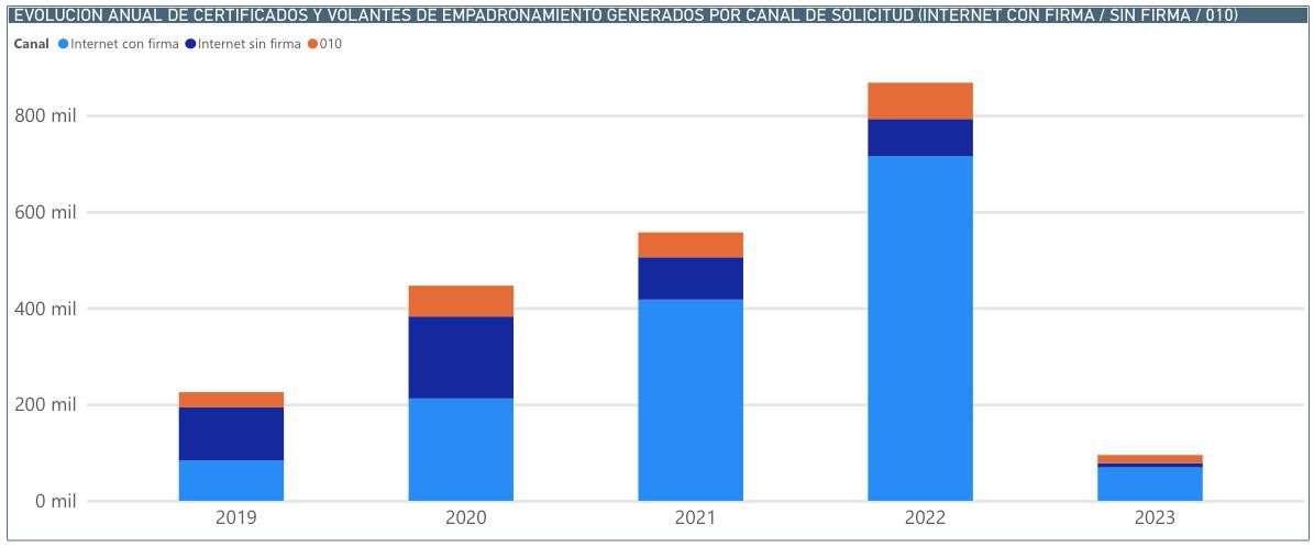 Entre las diligencias que involucran al Ayuntamiento, las que corresponden al padrón de habitantes destacan entre las más demandadas. Hasta hace dos años, la mayoría de los certificados se entregaban presencialmente y ahora se pueden descargar en un minuto desde el teléfono móvil. Los volantes de empadronamiento con firma se han multiplicado por 12 entre enero de 2019 y 2023: de 5.600 a 69.370. En 2022 se entregaron más de 800.000 certificados online frente a los 200.000 de hace cuatro años.