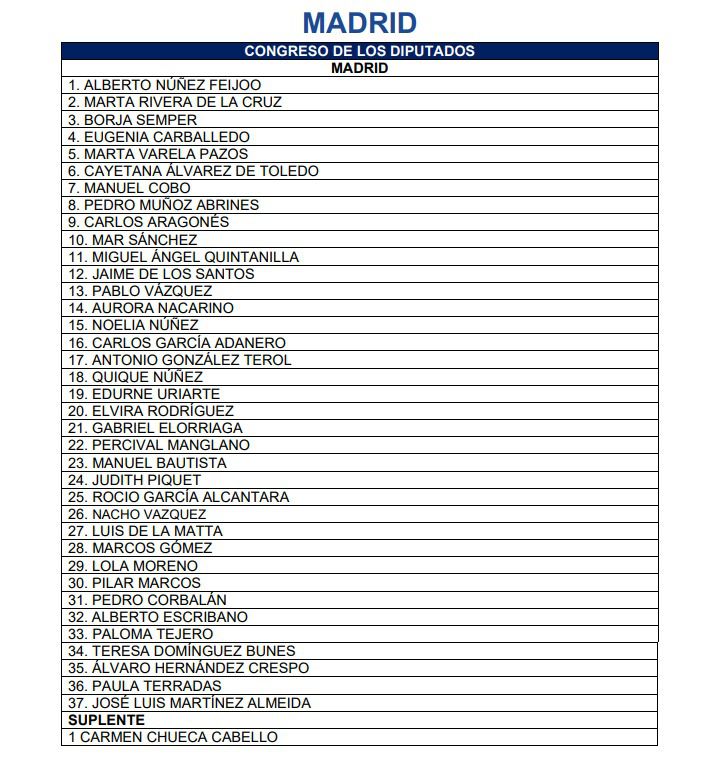 En los números nueve y en el once figuran los diputados Carlos Aragonés y Miguel Ángel Quintanilla, mientras que Feijóo rescata también a Carlos García Adadero, ex de UPN, que ha fracasado en su intento de ser alcalde de Pamplona, y que será el número 16. Cierra la lista por Madrid, el alcalde de la capital, José Luis Martínez Almeida.