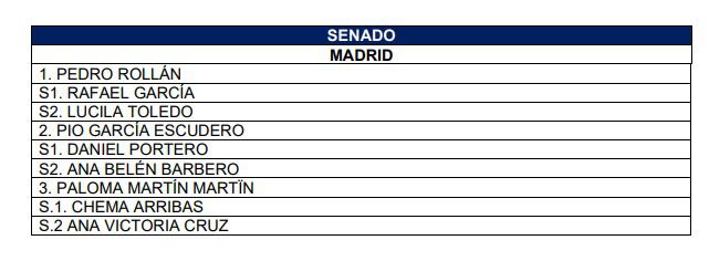 En cuanto a la lista del PP al Senado, la encabeza su vicesecretario de Coordinación Autonómica y Local, Pedro Rollán, le sigue Pío García Escudero y en el número tres ha incluido a la consejera de Medio Ambiente, Vivienda y Agricultura de la Comunidad de Madrid en funciones y diputada regional, Paloma Martín.