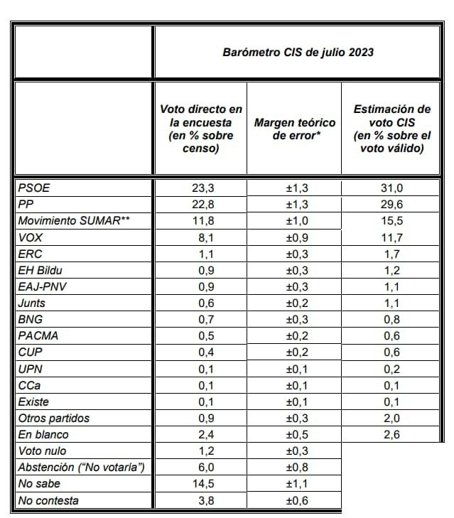 En este CIS se mantienen por tanto los actuales equilibrios de los bloques ideológicos: con estos datos, PP y Vox no superan a PSOE y Sumar y a sus socios parlamentarios. El CIS contradice a todos los demás sondeos, publicados en medios por empresas privadas de demoscopia.