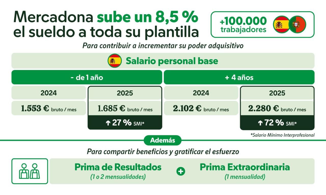 El Comité de Dirección de Mercadona ha decidido aumentar un 8,5 por ciento el sueldo de toda su plantilla con el objetivo de contribuir a incrementar su poder adquisitivo. Esta subida, que se hará efectiva a partir de la nómina de enero de 2025, alcanza a los más de 100.000 trabajadores que la compañía tiene en España y Portugal. El porcentaje de incremento es la suma del Índice de Precios de Consumo (IPC) correspondiente de cada país y un extra adicional decidido por la empresa hasta alcanzar este 8,5 por ciento.