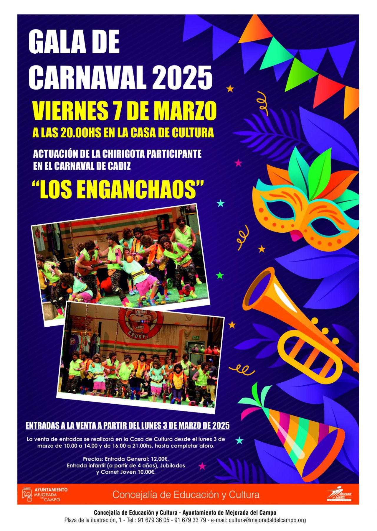 En Mejorada del Campo, los carnavales comienzan con un pasacalles que sale de la Casa de Cultura y finaliza en el pabellón de Deportes, donde realizarán la presentación de los participantes del concurso de disfraces y la Disco Baile con animación.