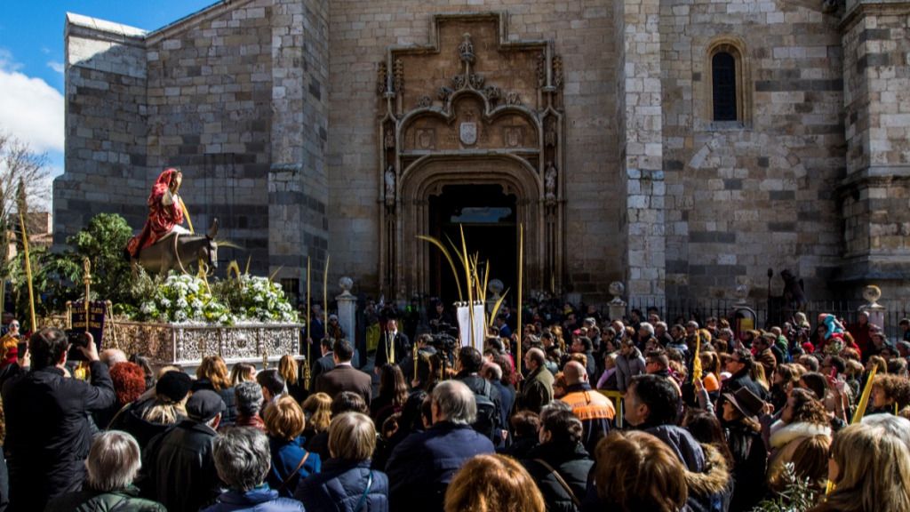 El Domingo de Ramos se caracteriza por la bendición de las palmas en la Plaza de la Constitución, seguido de un desfile procesional, que marca el inicio oficial de la Semana Santa. A lo largo del día, se celebran diversas misas, y a las 21:00 horas, el desfile procesional de la Cofradía de Nuestro Padre Jesús Caído, que se inicia en el Convento de las Carmelitas Descalzas, es otro de los momentos destacados.
