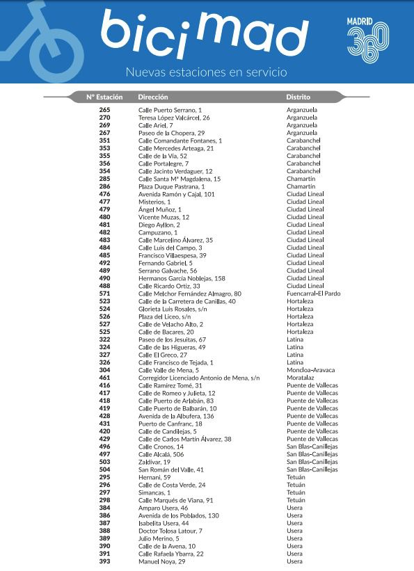 El nuevo sistema de bicimad está en marcha. La ampliación de la red de bicicletas eléctricas públicas, que implica duplicar el número actual de estaciones y renovar todas las antiguas, arranca este martes con el estreno de las primeras 60 bases integradas por 700 vehículos que se ubicarán en 13 distritos: Arganzuela, Carabanchel, Chamartín, Ciudad Lineal, Fuencarral–El Pardo, Hortaleza, Latina, Moncloa–Aravaca, Moratalaz, Puente de Vallecas, San Blas–Canillejas, Tetuán y Usera.