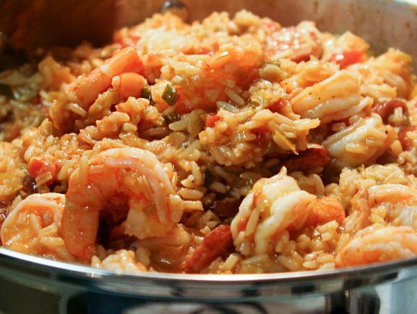 El jambalaya criollo nació en el primitivo centro, luego Vieux Carré o barrio francés de Nueva Orleans, donde los españoles y para la preparación del plato hacía tiempo que habían sustituido el azafrán por tomates ante el prohibitivo precio de la estigmática especia. Después, los franceses fueron dándole otro aire con la introducción de sus andouilles, salchichas de carne de cerdo ahumada y grasa aromatizada con ajo, cebolla y vino, el uso generoso de especias caribeñas y la llamada “santísima trinidad francesa”, un agregado de cebolla, apio y pimientos finísimamente cortados. A todo ello se añaden luego pescados y mariscos, para, por último, verter el arroz y retirar del fuego cuando el cereal se haya hecho al punto y en fusión de sabores y aromas, tal y como se ha venido haciendo desde tiempo inmemorial en la albufera primigenia.