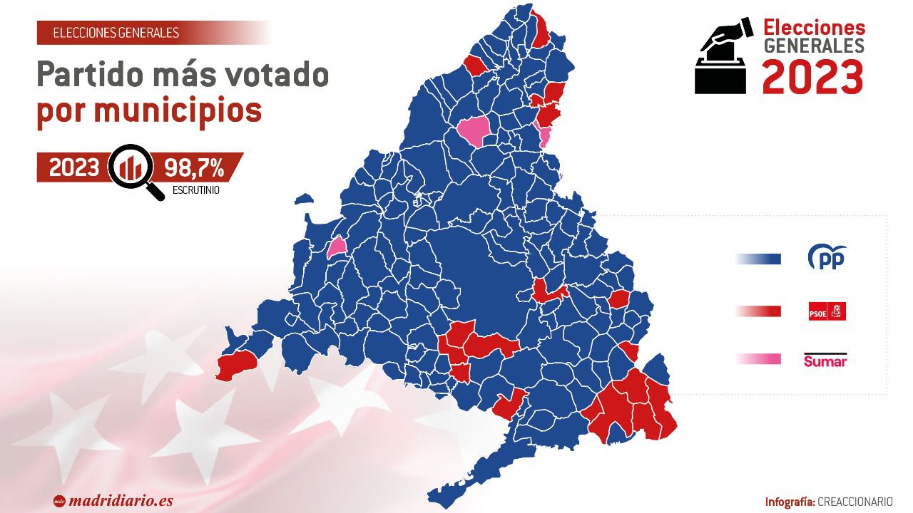 El Partido Popular (PP) ha ganado en 158 de los 179 municipios de la Comunidad de Madrid, mientras que el Partido Socialista Obrero Español (PSOE) ha sido el partido más votado en 19 municipios y Sumar, la formación más votada únicamente en dos localidades.