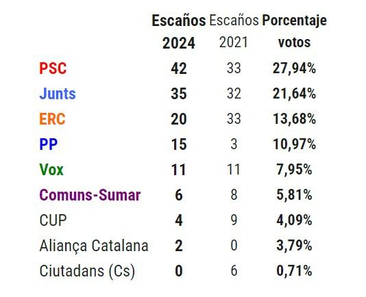 Ahora mismo, con estos datos, Junts y ERC no suman para formar gobierno y tampoco con otras formaciones independentistas, como CUP y Aliança Catalana.